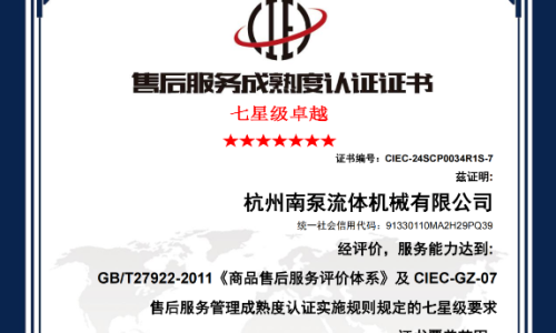 杭州南泵售后獲得《商品售后服務(wù)達(dá)標(biāo)認(rèn)證五星級(jí)證書(shū)》《售后服務(wù)體系管理成熟度認(rèn)證七星級(jí)(卓越)證書(shū)》等各類服務(wù)認(rèn)證